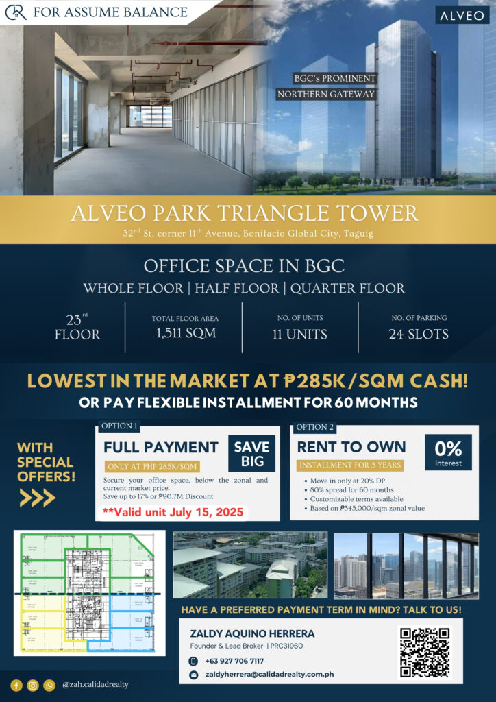Rent to own office space in BGC, Alveo Park Triangle office for sale, BGC commercial space for sale, Bonifacio Global City office investment, 0% interest office rent to own, buy office space in Taguig, BGC real estate investment, premium office units BGC, whole floor office space Manila, Taguig office tower investment